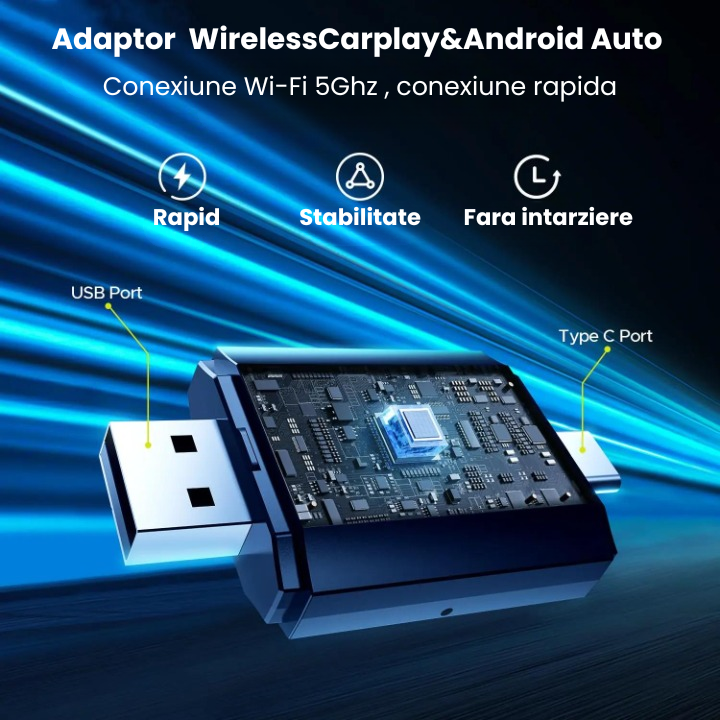 Un adaptor auto CarPlay & Android Auto este un dispozitiv compact care iti permite sa conectezi telefonul la sistemul masinii fara fir. In loc sa folosesti cablul clasic pentru Apple CarPlay sau Android Auto, conectarea se face wireless, prin Bluetooth si Wi-Fi, pastrand toate functionalitatile oferite de sistemul multimedia.