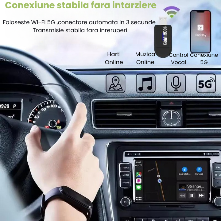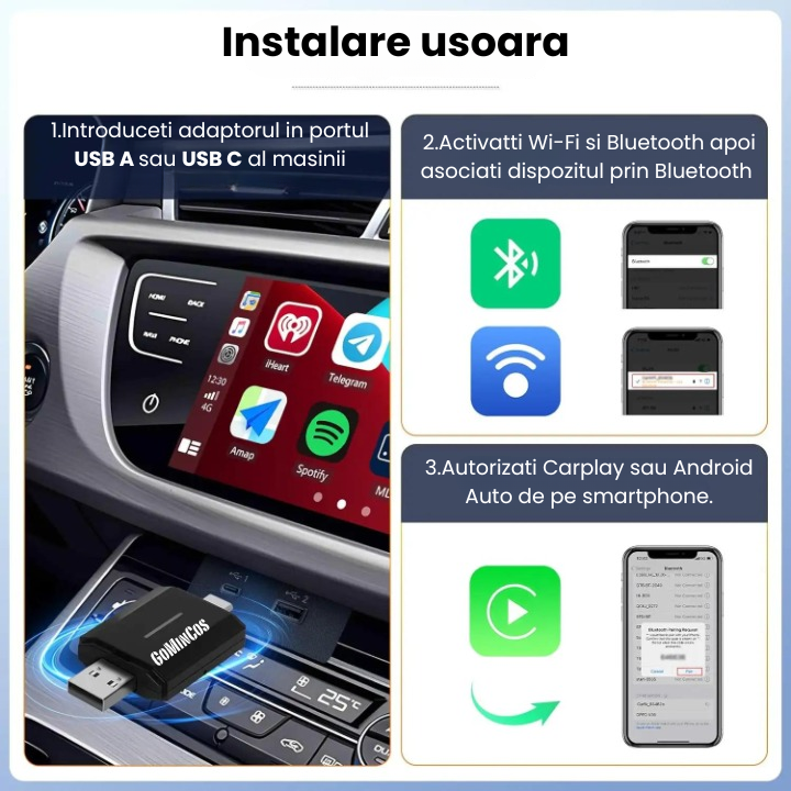 Transforma-ti masina intr-un sistem multimedia inteligent cu adaptorul wireless GoMinCos pentru CarPlay & Android Auto. Fara cabluri, fara setari complicate, doar conectare rapida si o experienta moderna la volan.