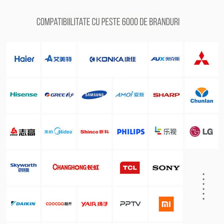 Aceasta telecomanda smart functioneaza cu mii de branduri cunoscute: Samsung, LG, Sony, Philips, Xiaomi, Daikin, Haier, Midea si multe altele.